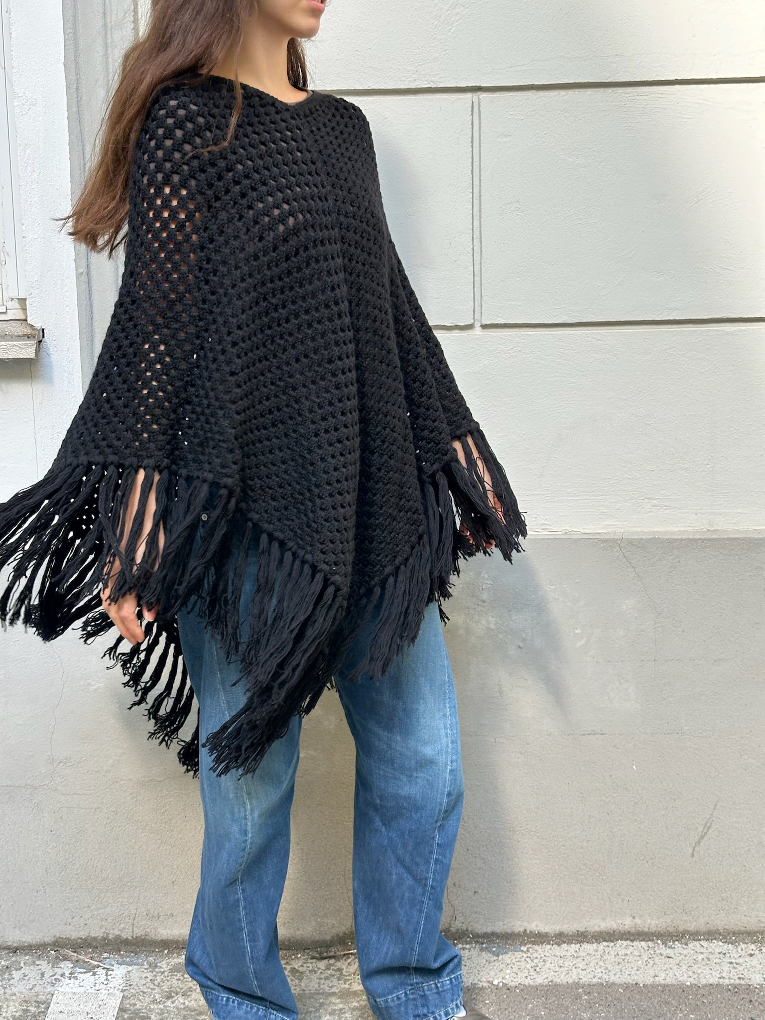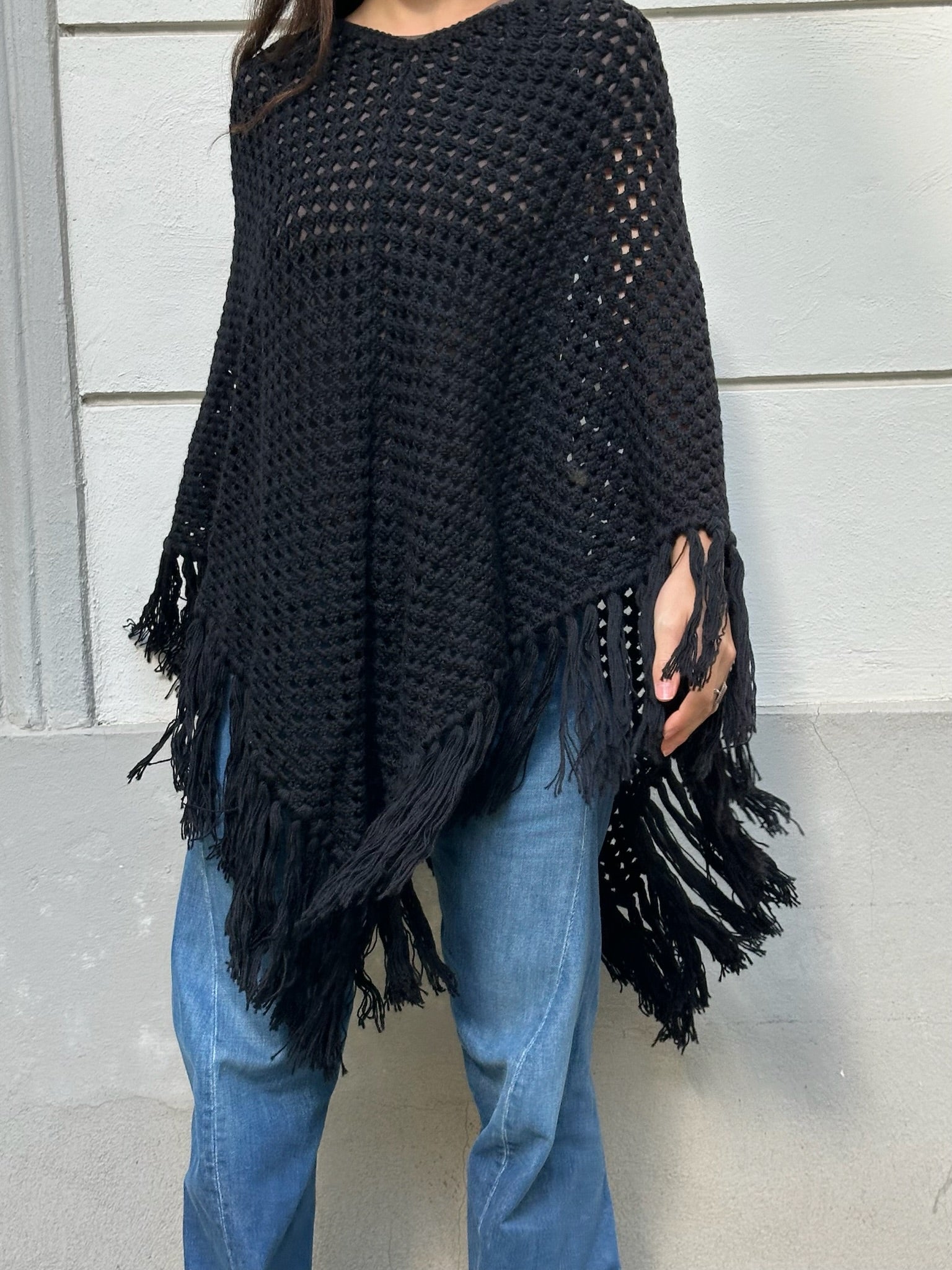 Black Wool Blend Fringe/Tassel Poncho One Size