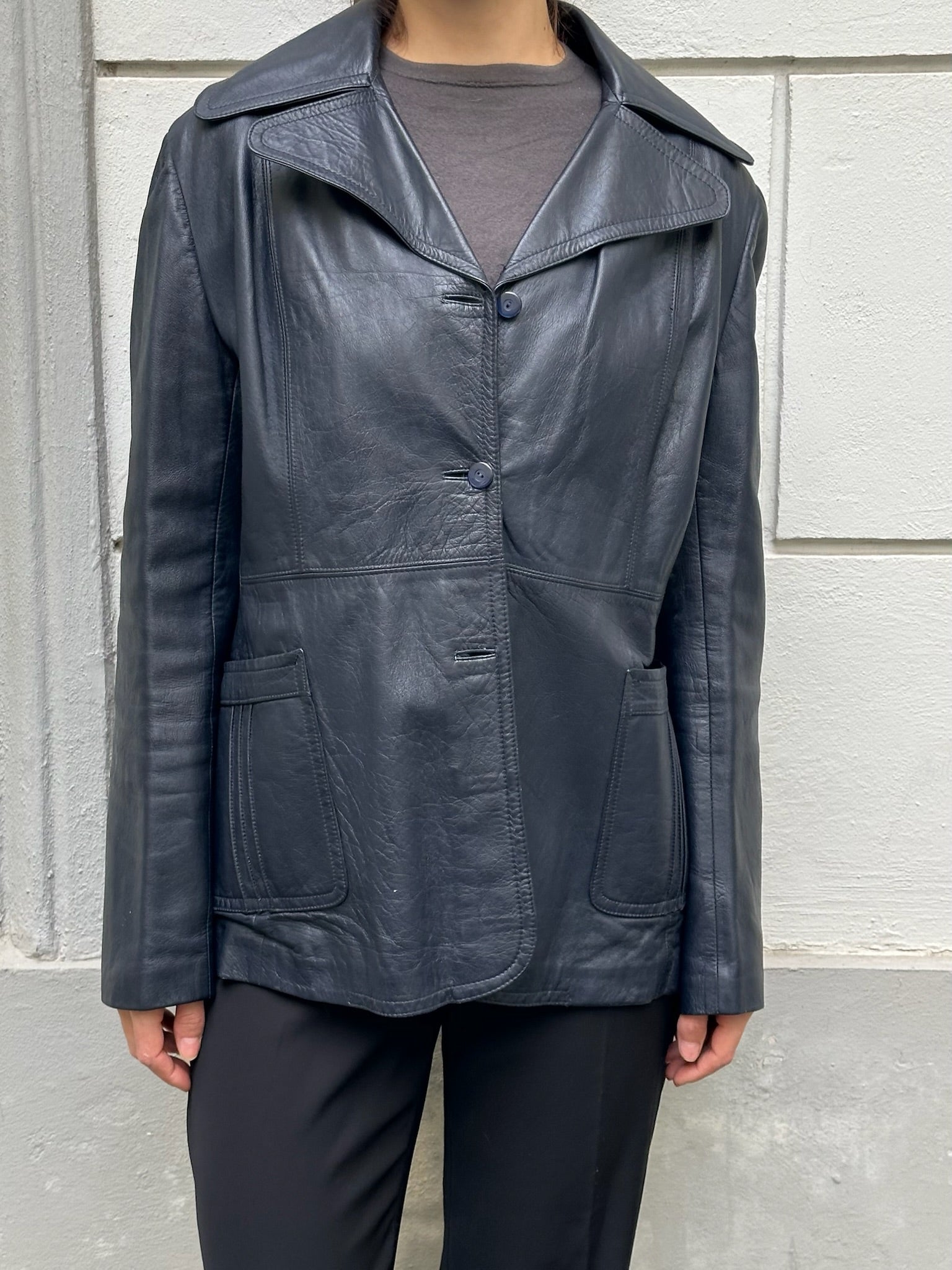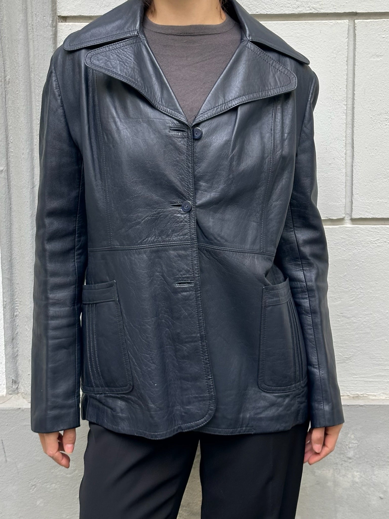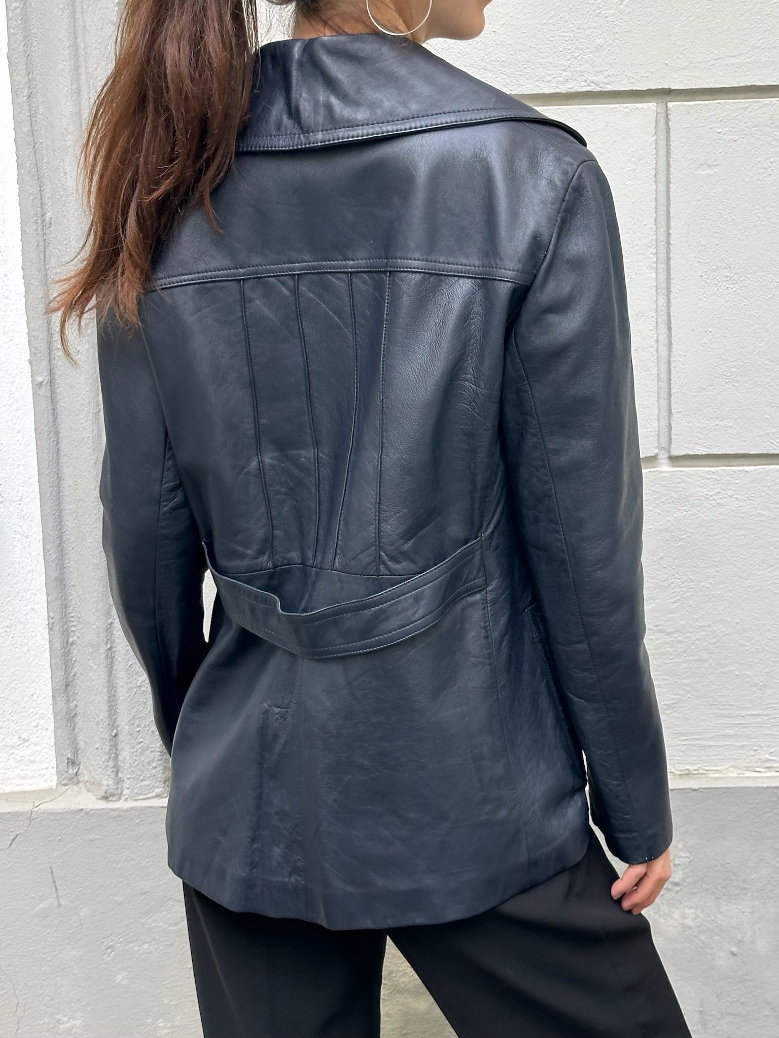 Retro chic dark blue leather jacket with large lapels. Really great piece to break an all black outfit or for pairing with any shade of gray <3