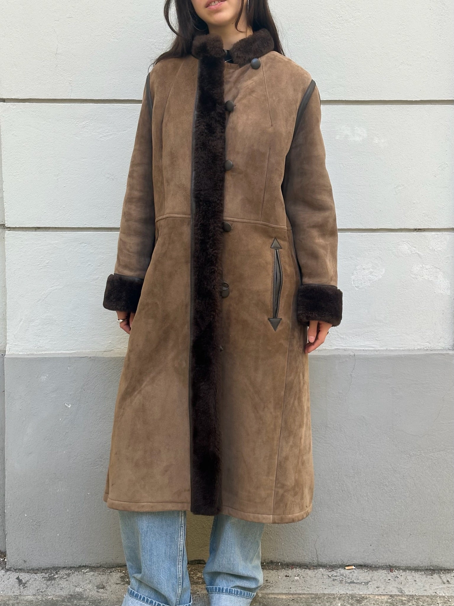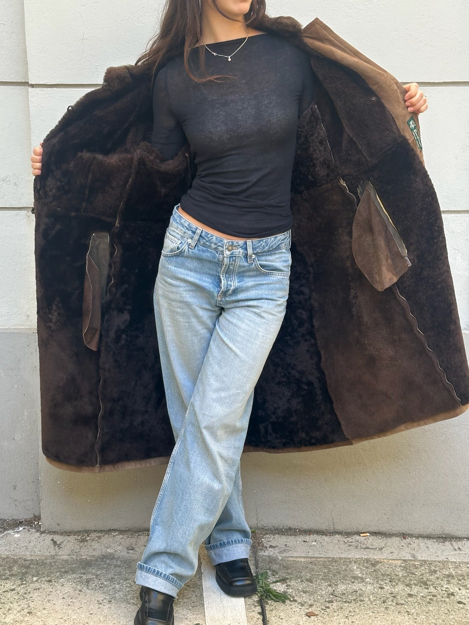 Vintage 100% Genuine Shearling Long Brown Coat S/M