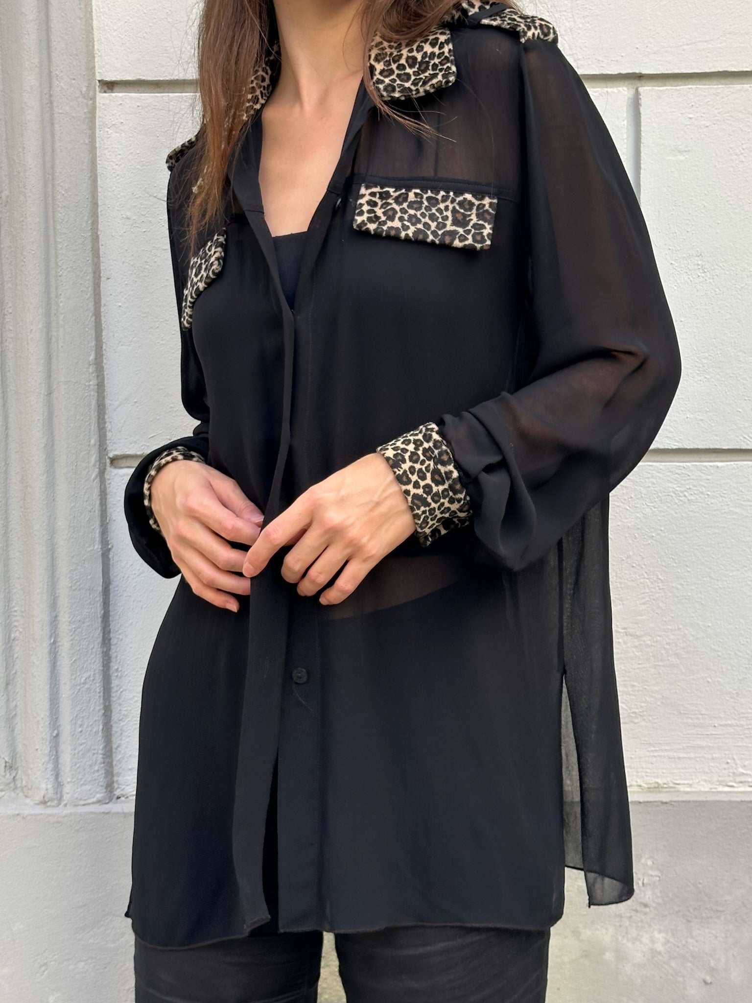 Vintage 100% Viscose Cheetah Trim Black Sheer Blouse M