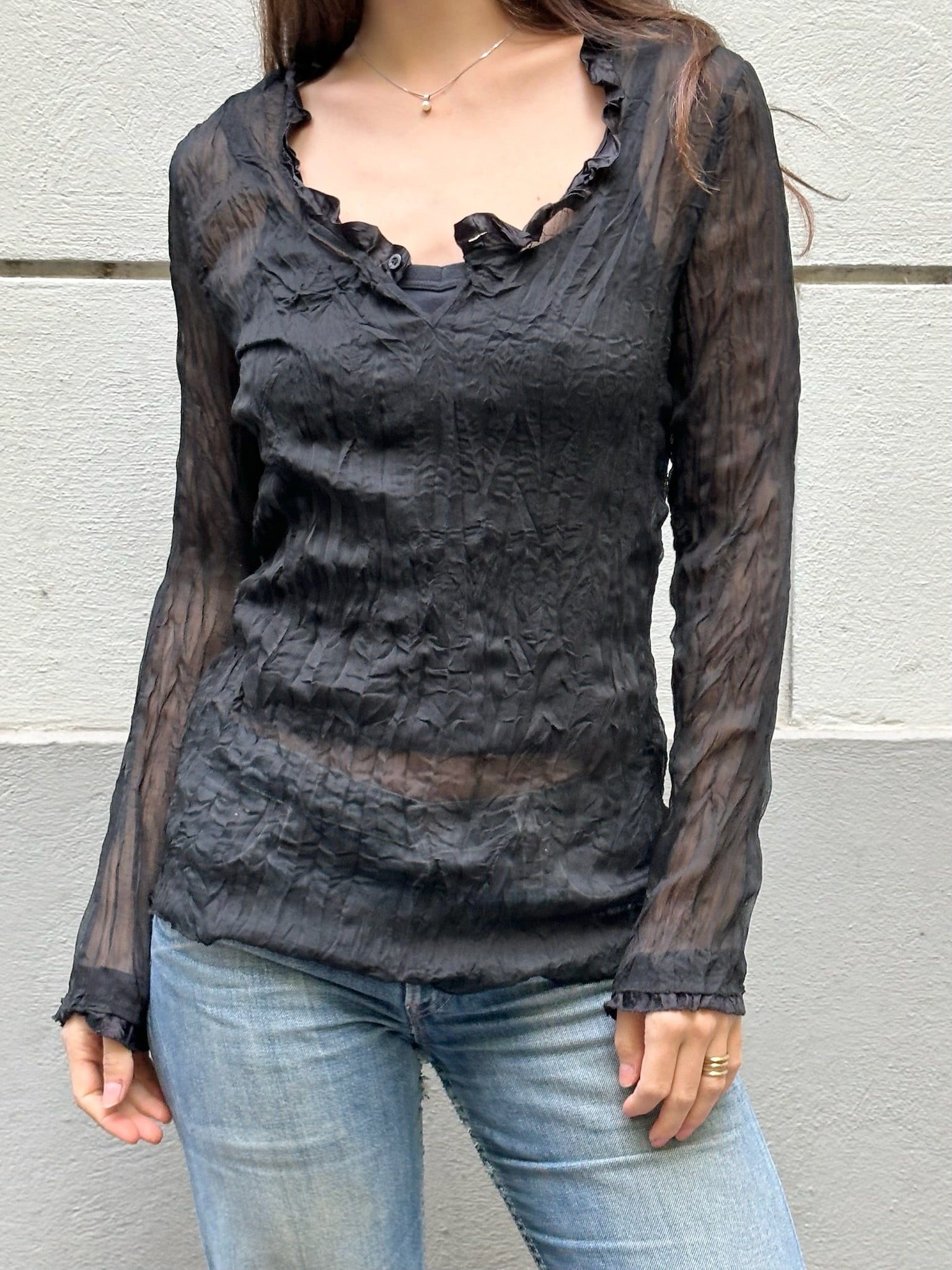 Gorgeous black sheer blouse that is naturally crinkly so you will never need to steam it. Great for layering and wearing nearly all year long.