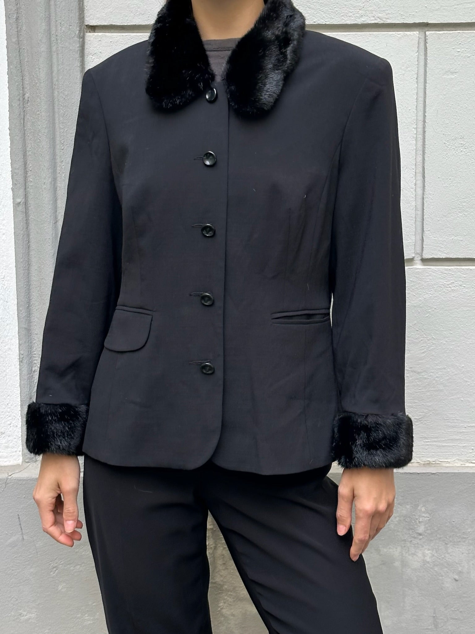 LOOVE! Simple and elegant jacket for going out or to wear to a fancy event. The faux fur trim is a fun detail <3