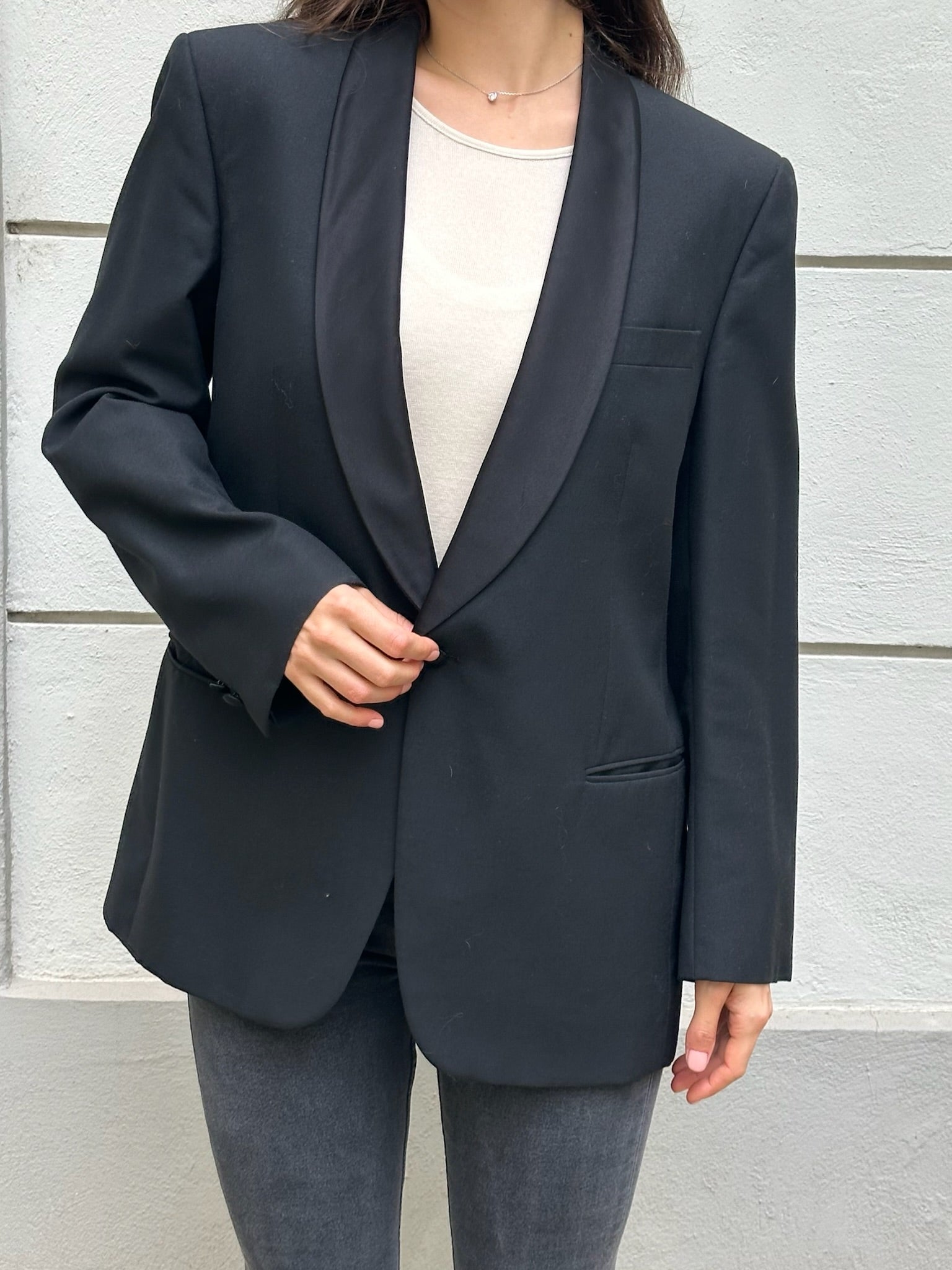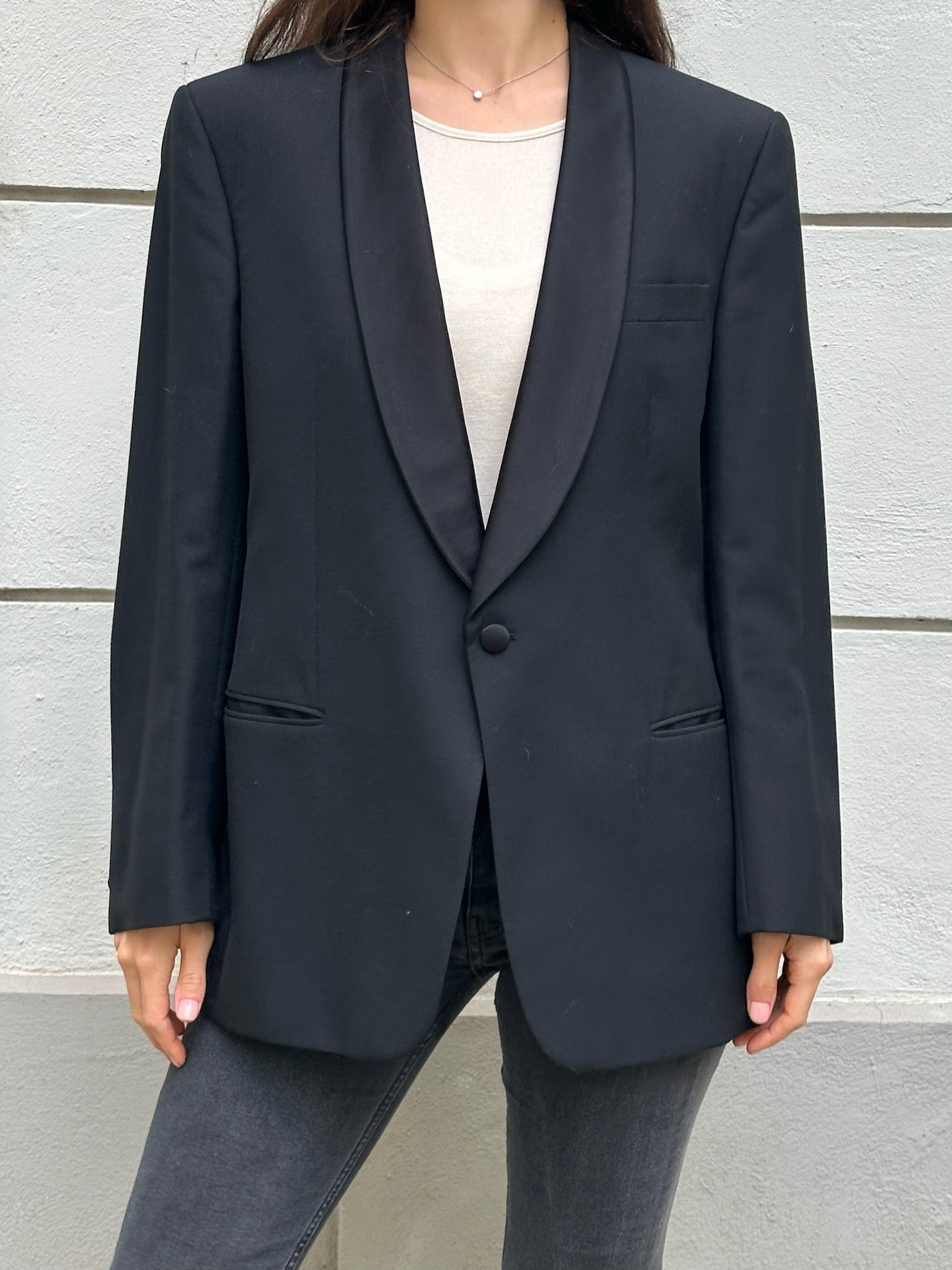 Beautiful classic and chic blazer in a wool blend, this piece is great for the office or for throwing over baggy jeans and a cute top to go out.