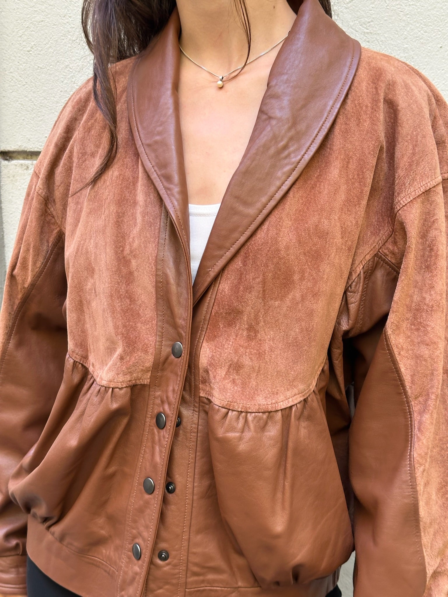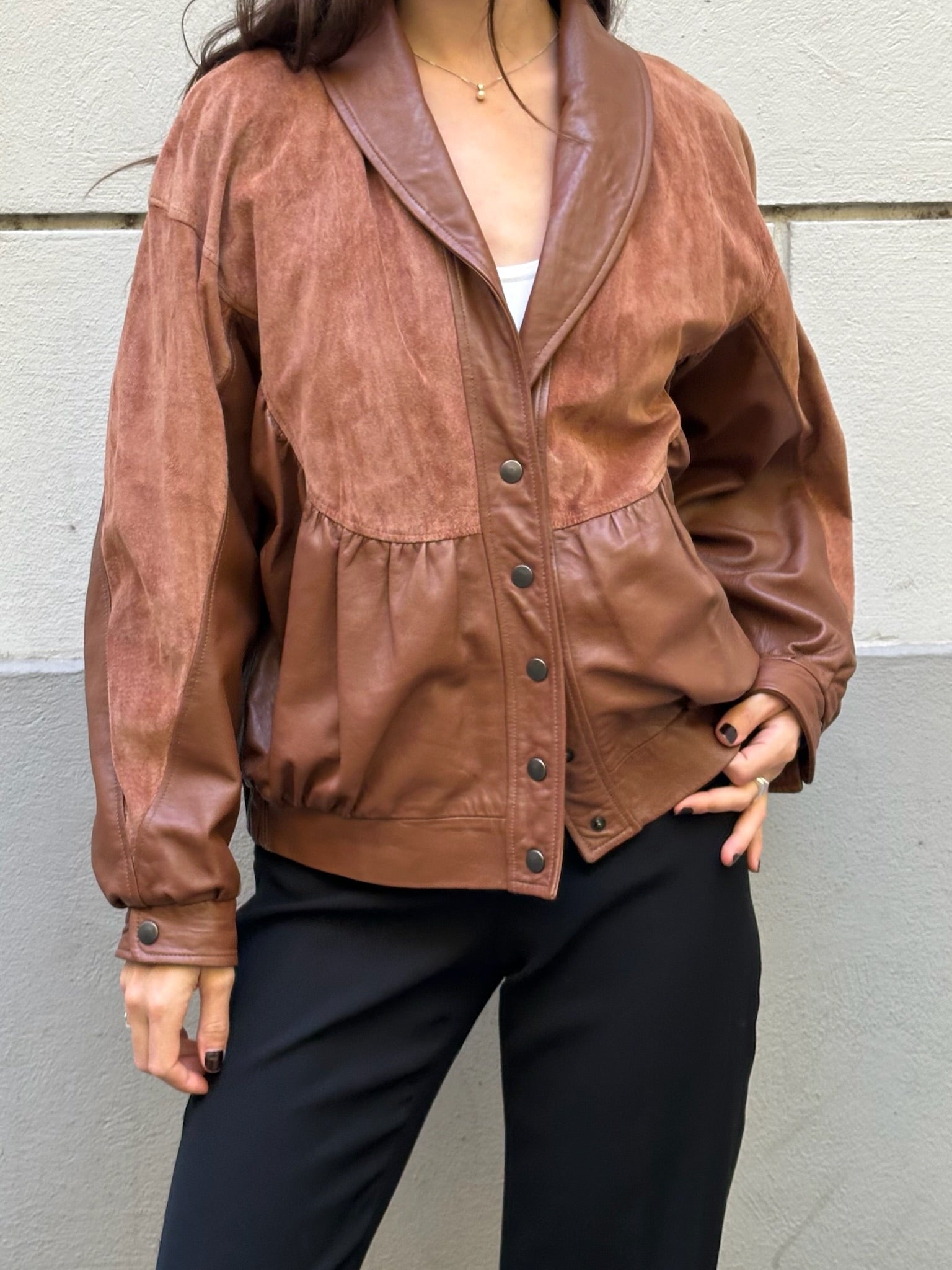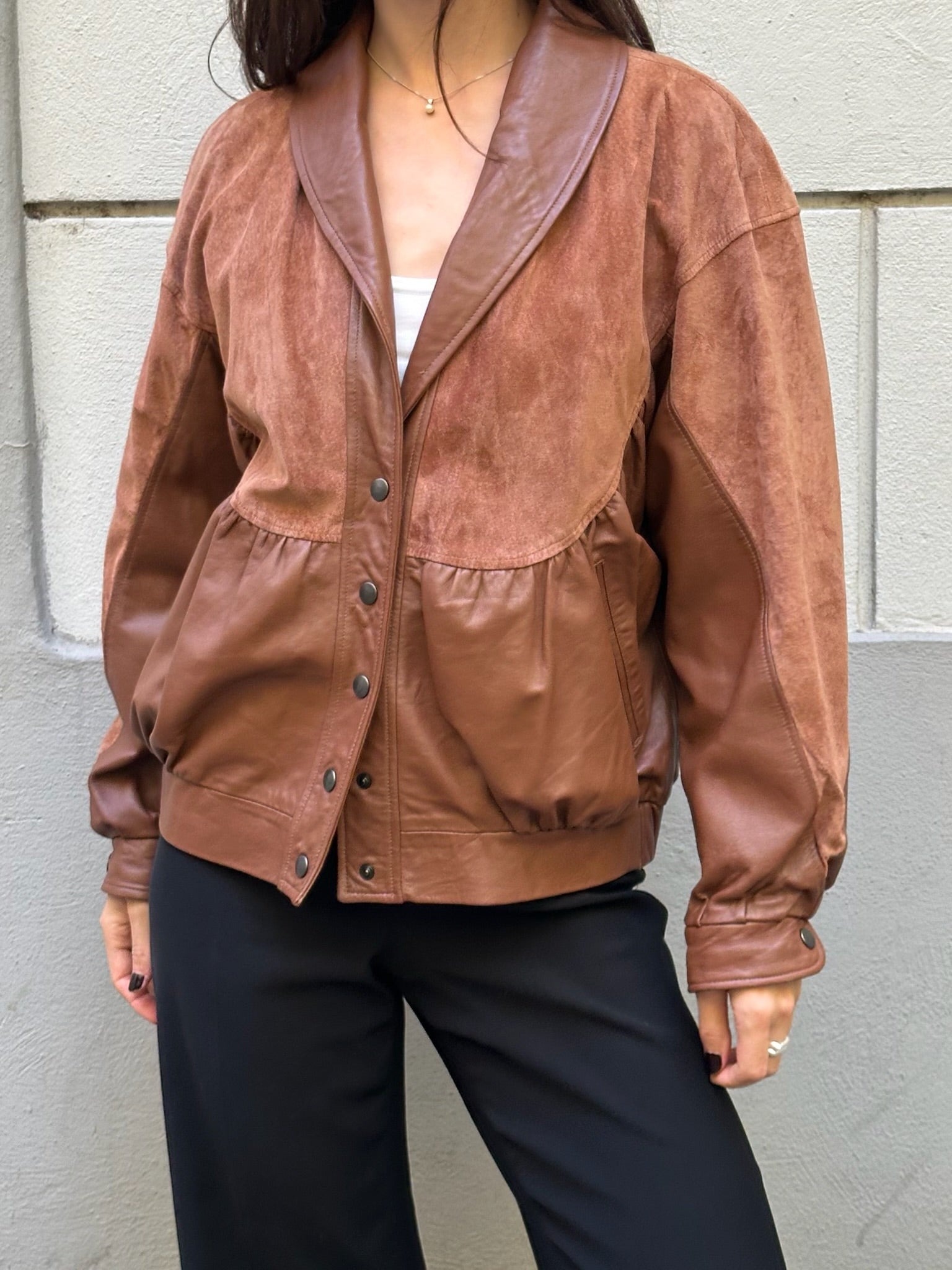 This bad boy looks like he's straight from the 80's! Cool aviator style leather number with suede panels. Soft and cozy, great for layering with thick sweaters underneath.