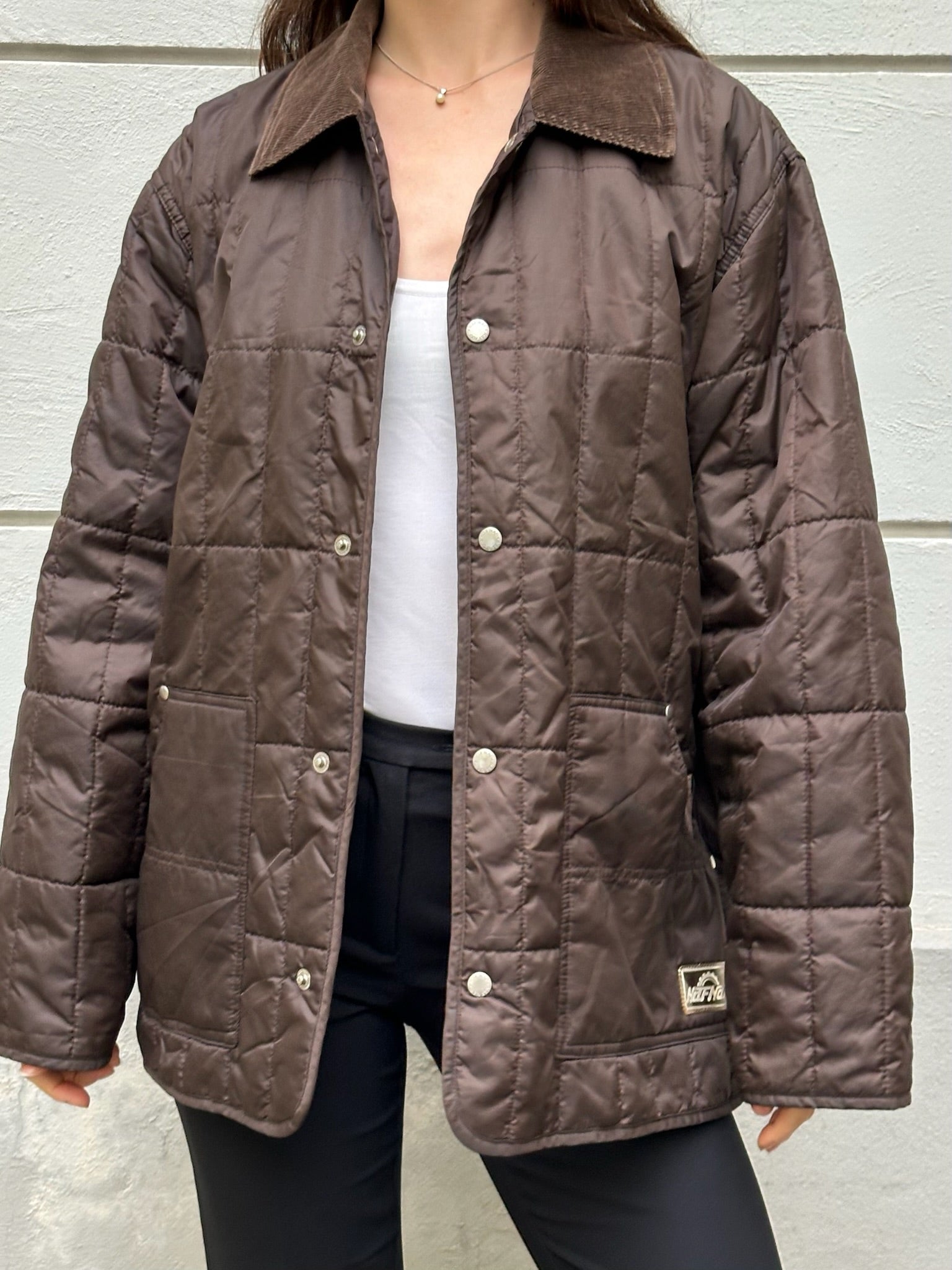 Delicious chocolate brown barn jacket with a very cool and timeless fit. Wear it with high waisted fitted trousers and heeled boots for a cool contrasting vibe.