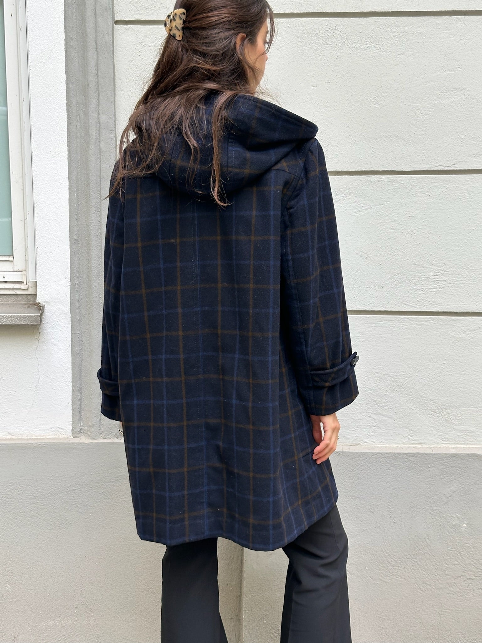 Vintage Navy Blue Plaid 100% Virgin Wool Coat With Hoodie M