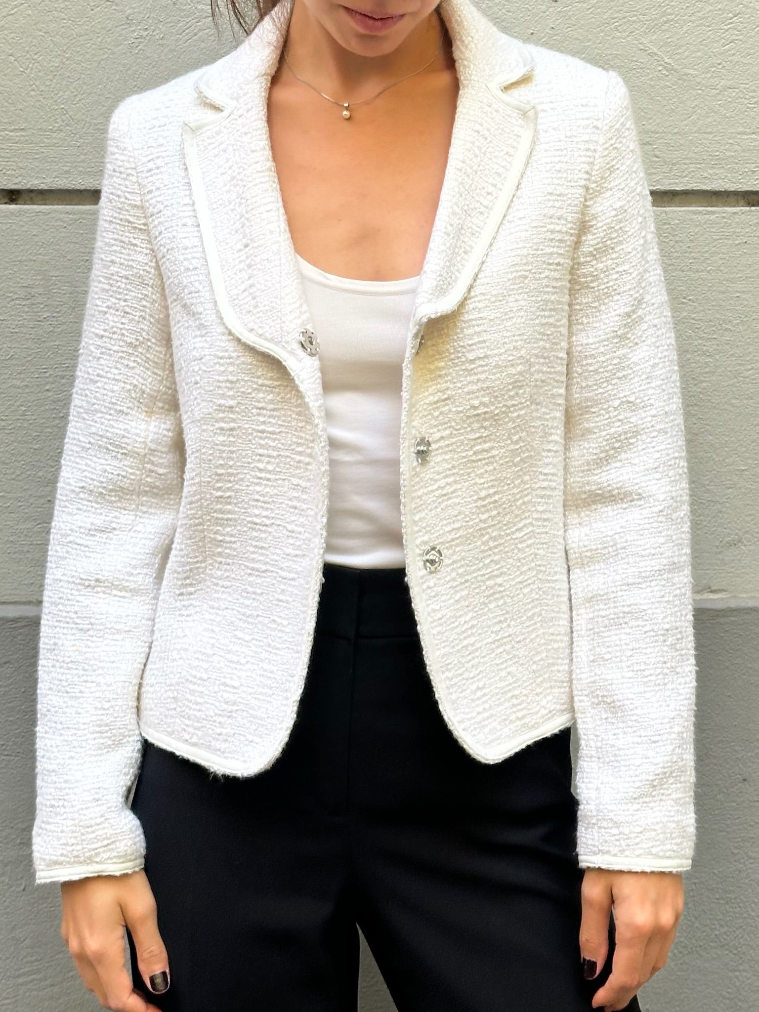 Extremely elegant and timelessly chic blazer jacket that is on the more fitted side. Pair this cutie with baggy jeans or simple tailored trousers. Feels soft and cozy.