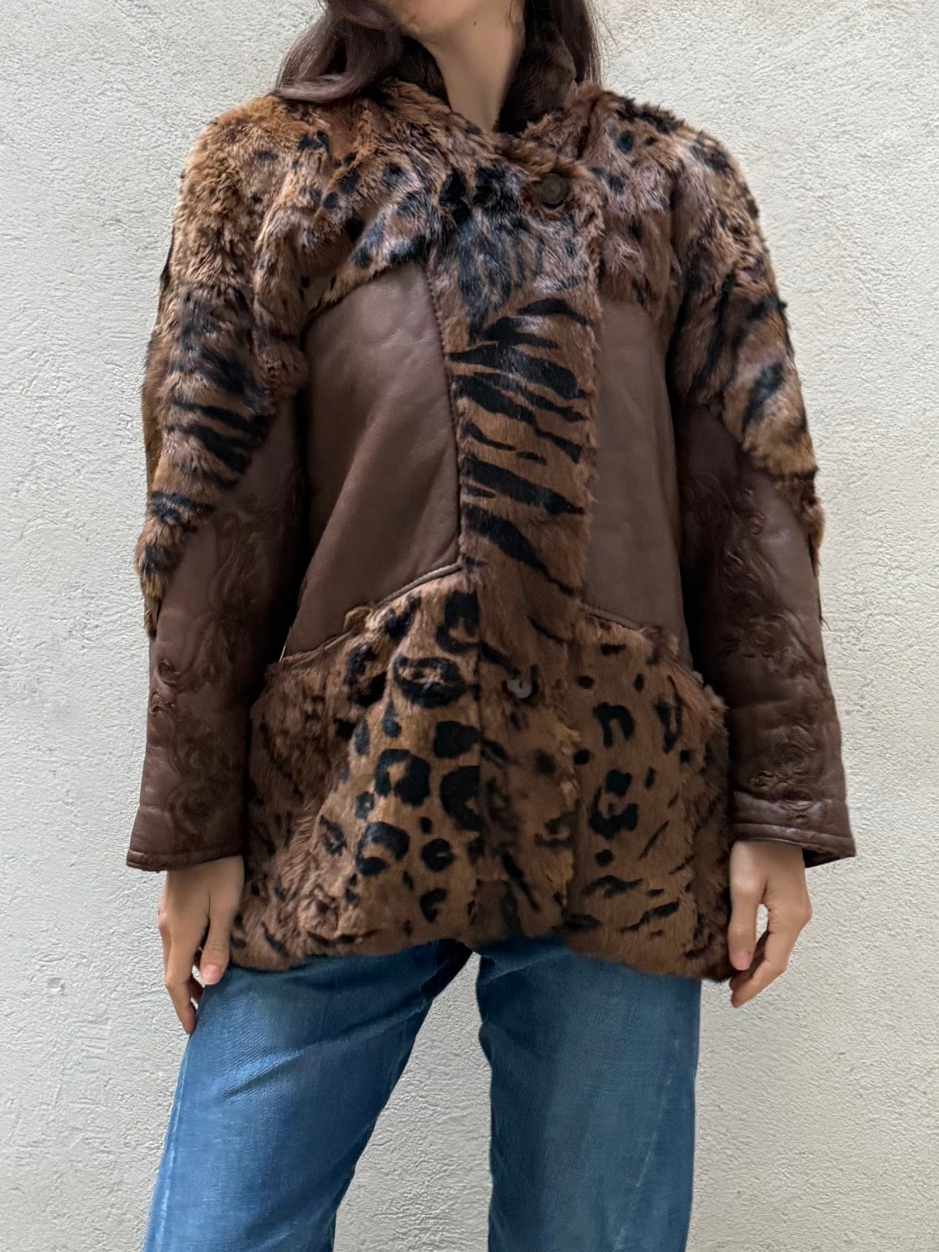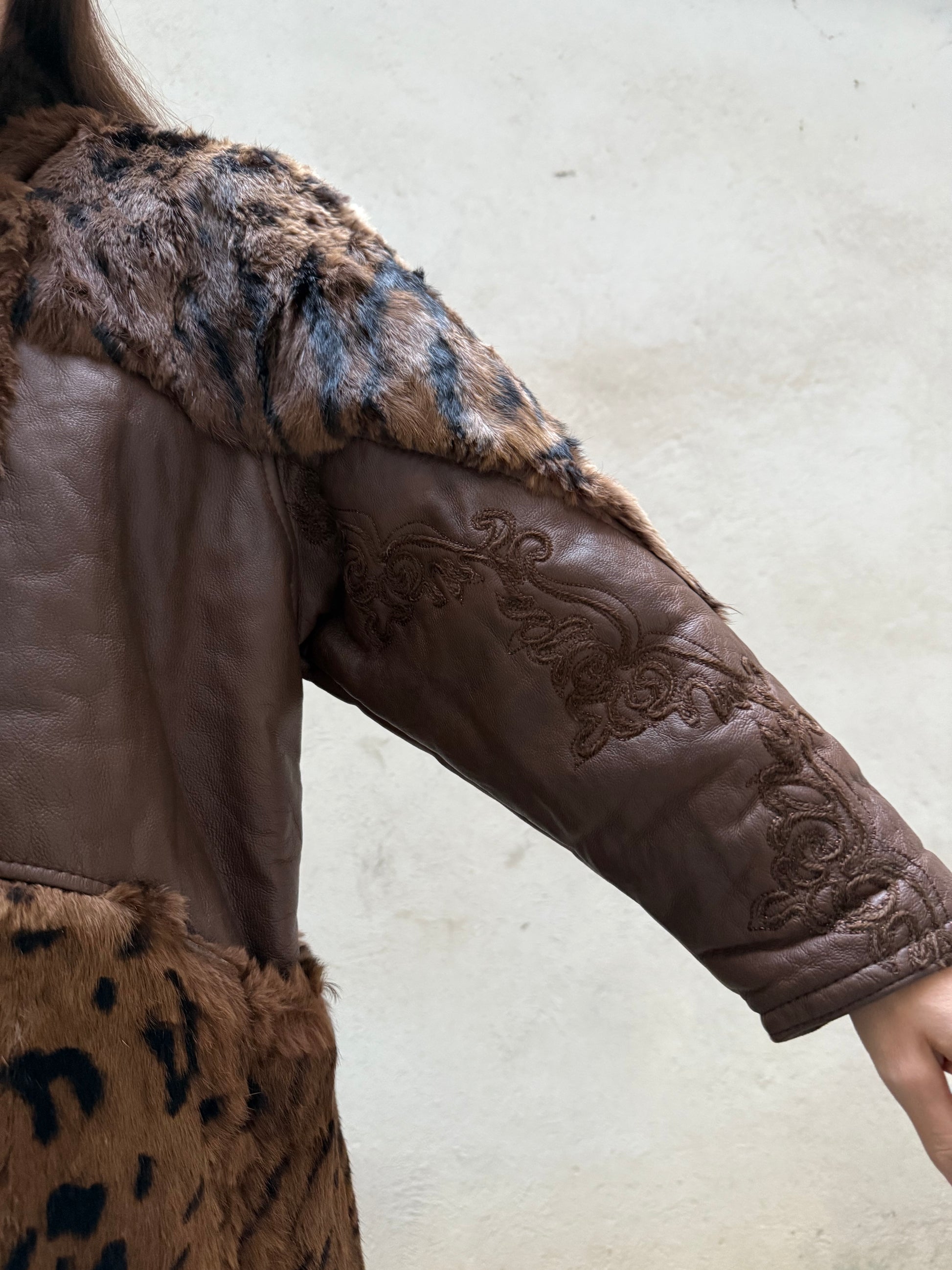 Vintage Tiger/Cheetah Real Lamb Shearling & Fur Brown Embroidered Coat