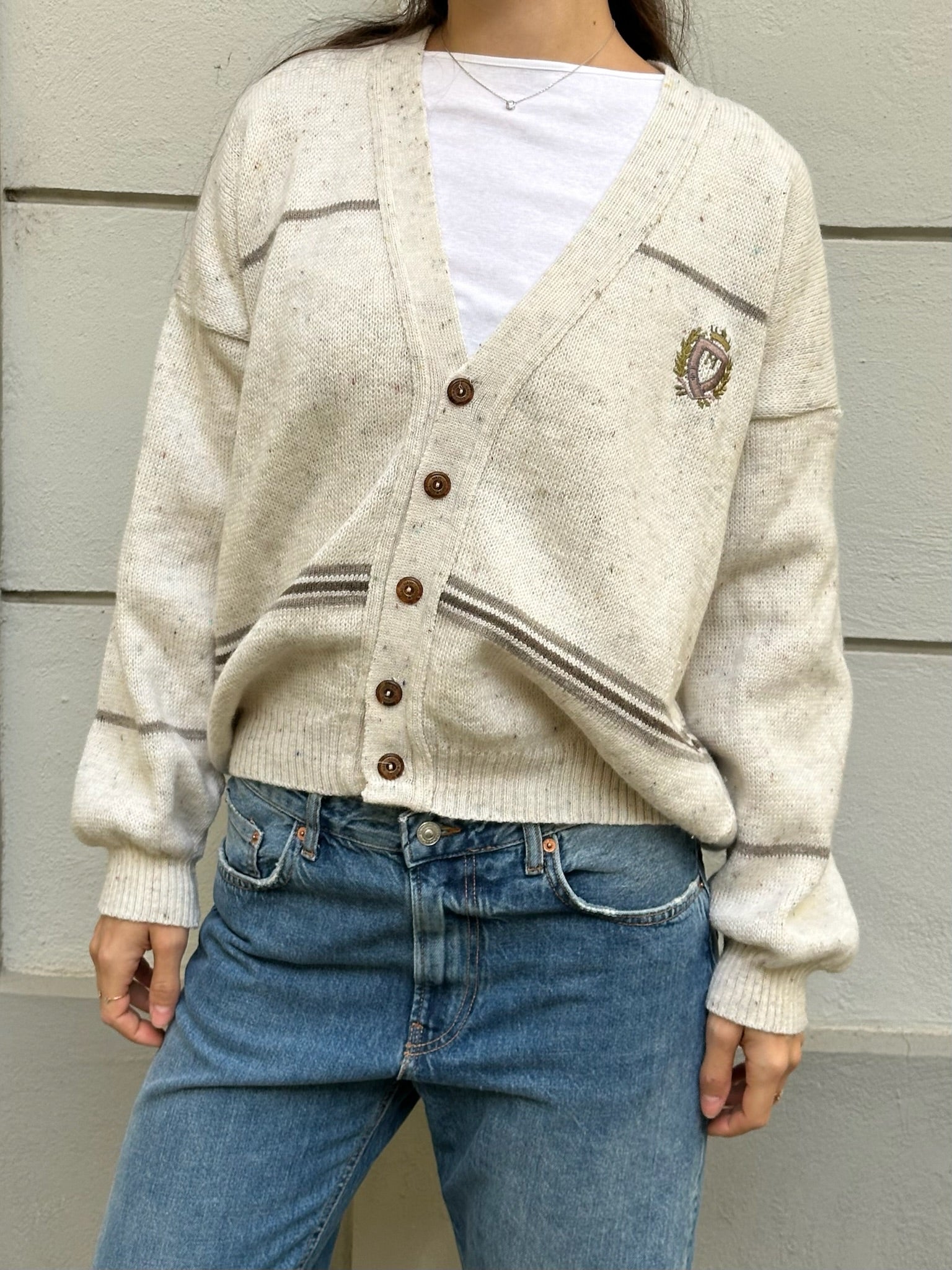 LOVE! gorgeous speckled wool blend cardigan sweater that is laidback and casual, giving old money chic