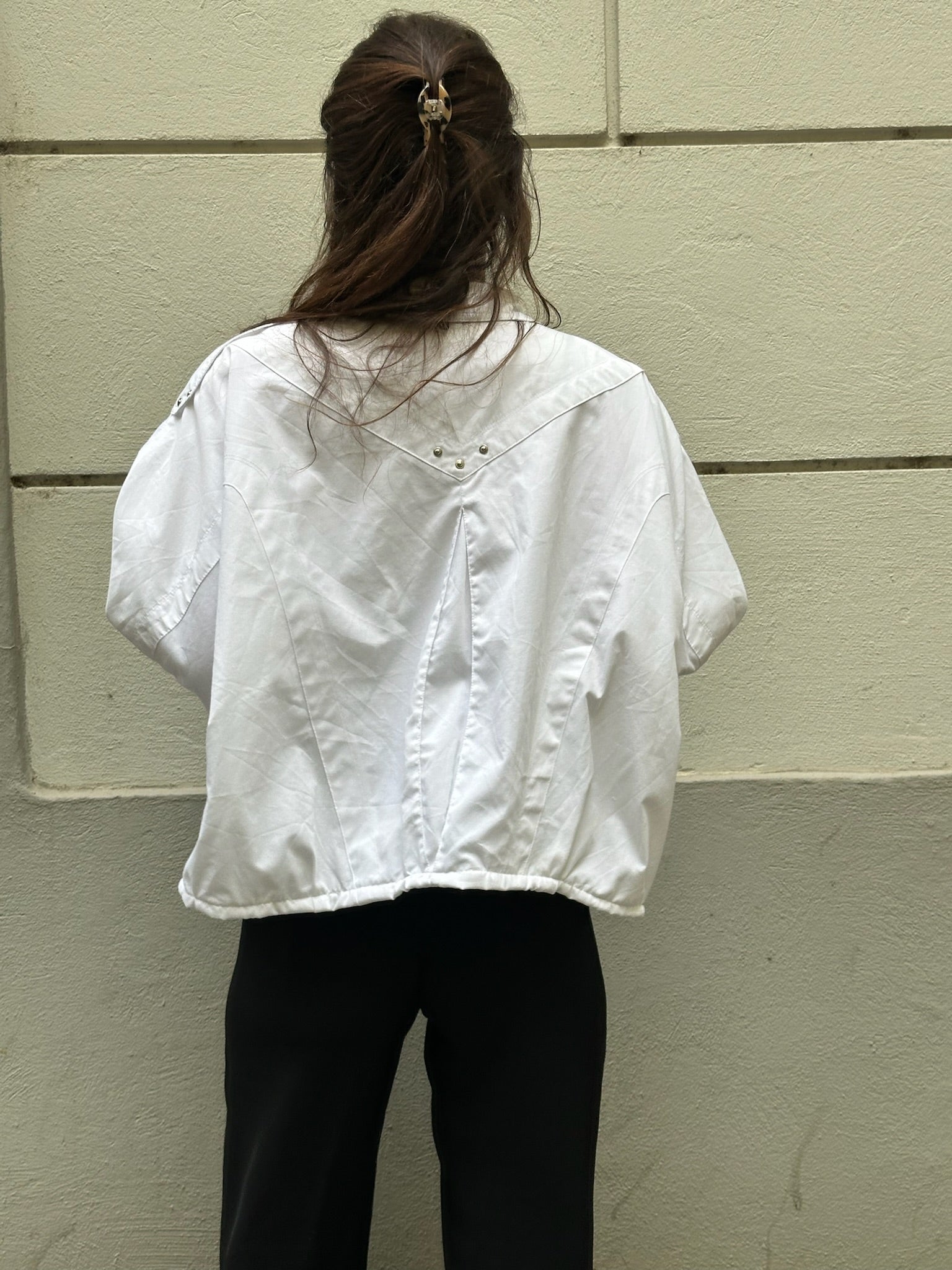 Really great lightweight and thin white jacket that is oversized and suitable for layering lots underneath.