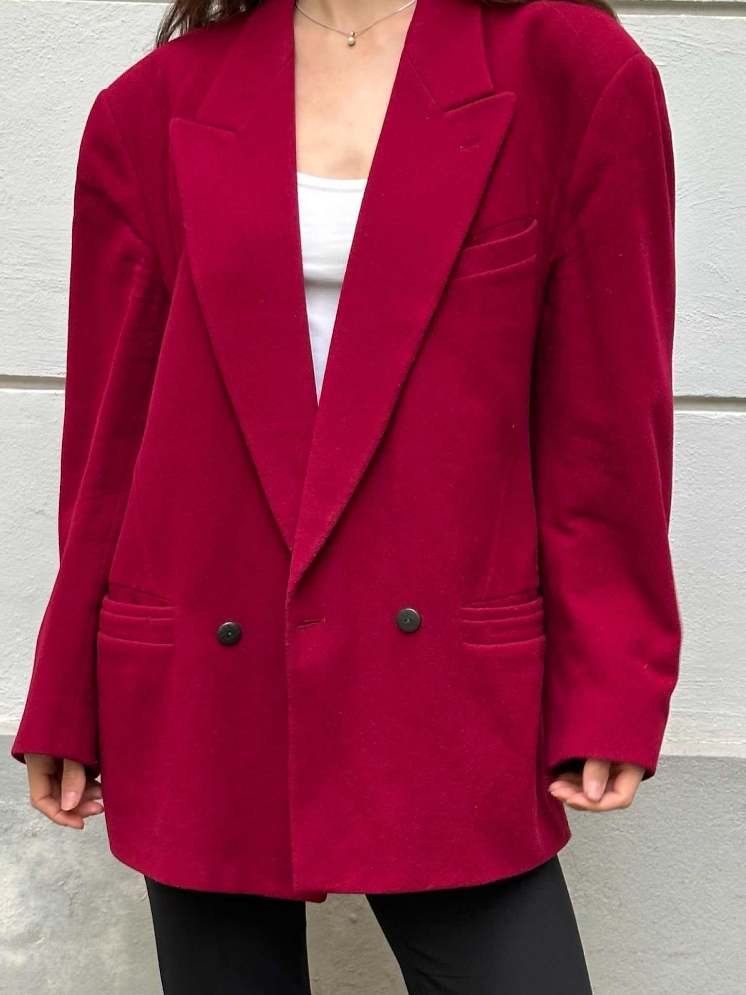 Large and in charge beautiful deep cherry red blazer that is soft and warm yet lightweight. Perfect blazer for Autumn.
